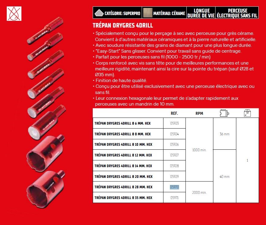 - Spécialement conçu pour le perçage à sec avec perceuse sur carreaux en grès cérame
